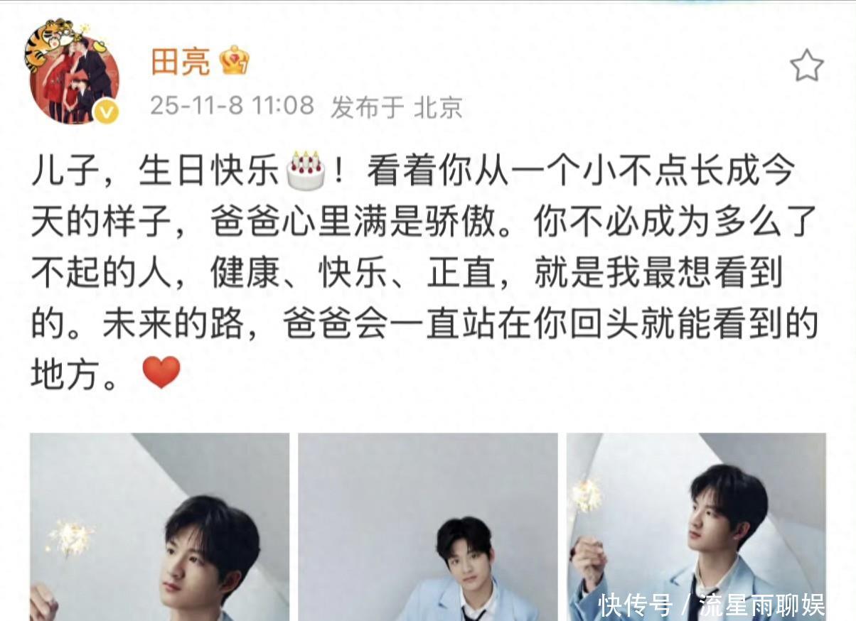 11月8日,田亮在微博晒出儿子小亮仔的14岁生日照。照片里,田宸羽穿着西装,个子已经超过爸爸了。田亮写着“儿子,生日快乐”,说心里满是骄傲,希望儿子健康快乐正直就好。“我怀里的小男孩,背影已有了少年的模样”,这是田亮晒照时的感慨,这时候他就发现,儿子真的长大了。
